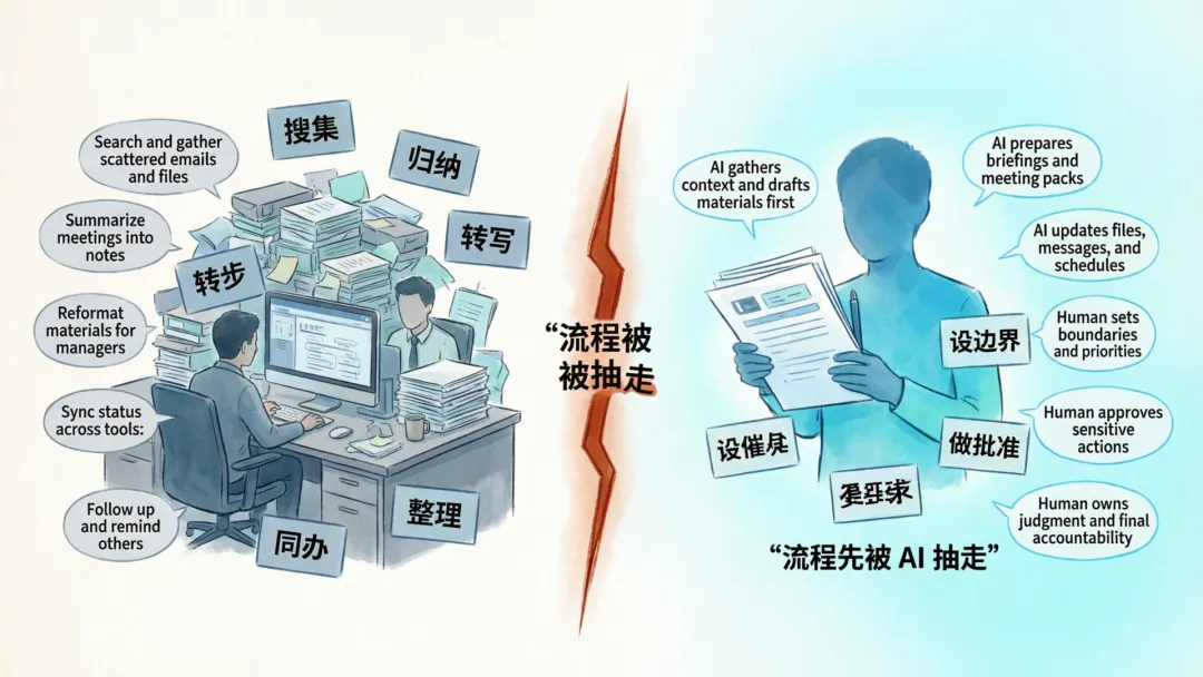 过去大家担心的是“AI 会不会直接替代我”;现在更现实的问题是,“我负责的那部分流程,会不会先被 AI 抽走”。如果你的工作主要是搜集、归纳、转写、整理、同步、催办,那风险已经不是很远的未来,而是产品经理和 IT 部门一旦放开权限,你的很多动作就会被系统默认接管。不是因为 AI 突然有了人的判断力,而是因为这些动作本来就足够结构化,足够适合被交办。