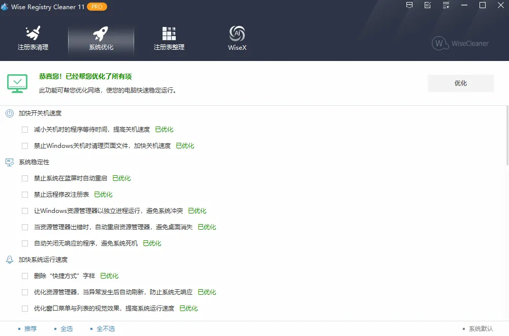 (可选)你可以去“系统优化”板块,根据自己的需求,对开机速度、网络、系统稳定性等进行一键优化。