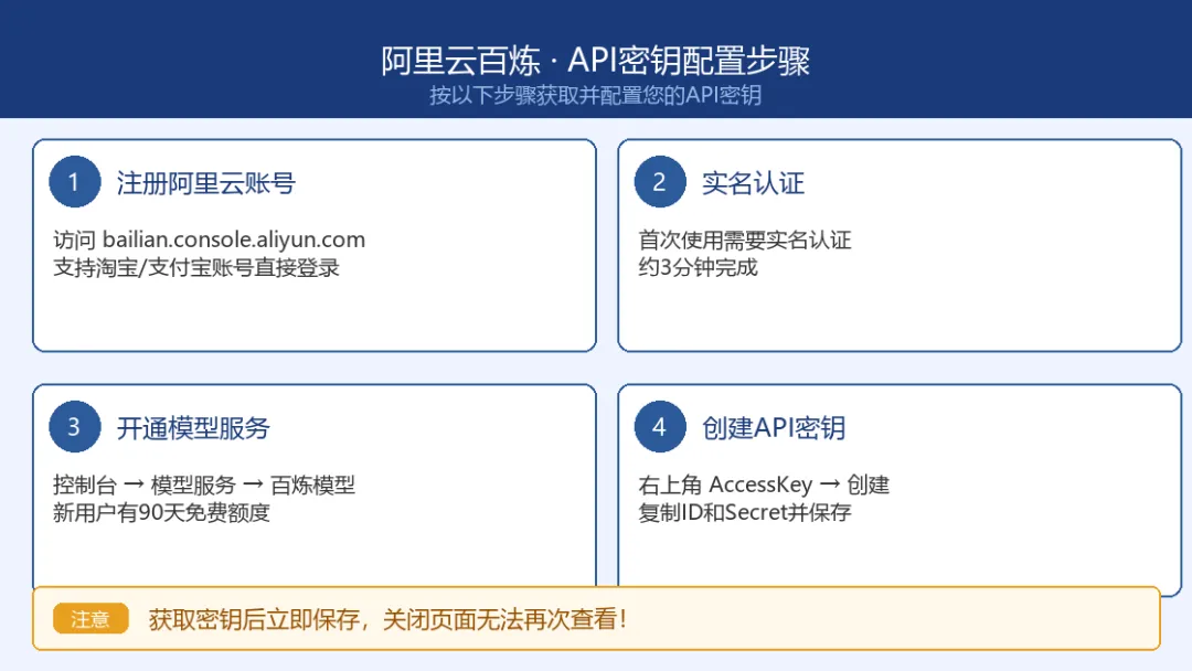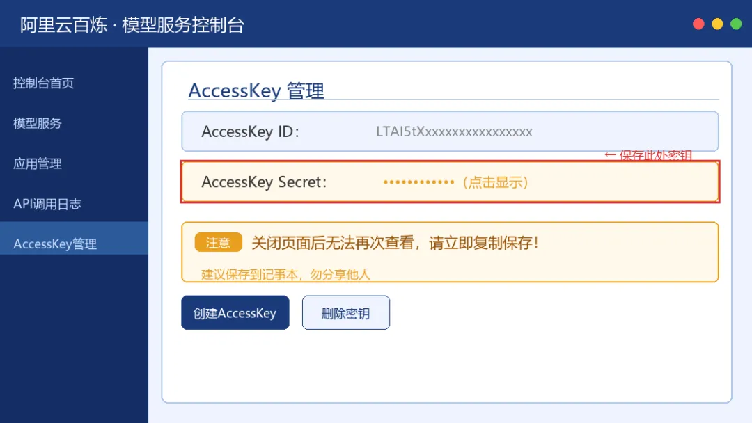 图5:阿里云百炼API密钥获取步骤——请隐藏你的AccessKey Secret