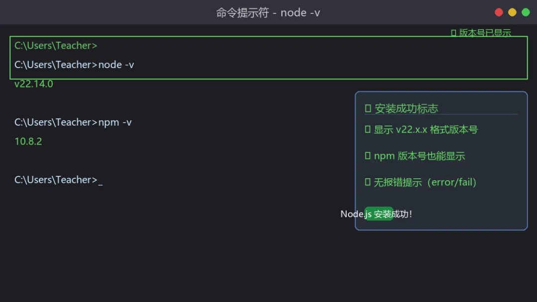 ✅ 验证方法 •输入 node -v,显示版本号(如 v22.14.0)→ 成功 •输入 npm -v,显示版本号(如 10.8.2)→ 成功 •没有报错(error/fail)→ 成功 |
