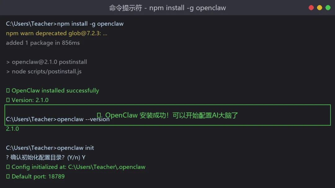 图4:OpenClaw安装成功——命令行显示版本号和初始化成功
