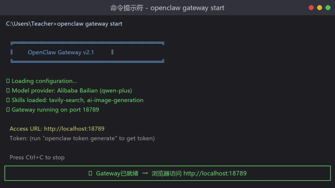 显示"Gateway running on port 18789"即启动成功。