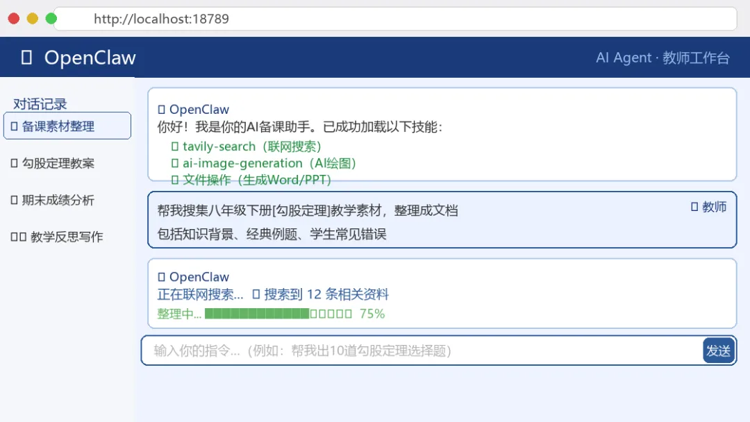 图7:OpenClaw Web控制台界面——AI备课助手已就绪