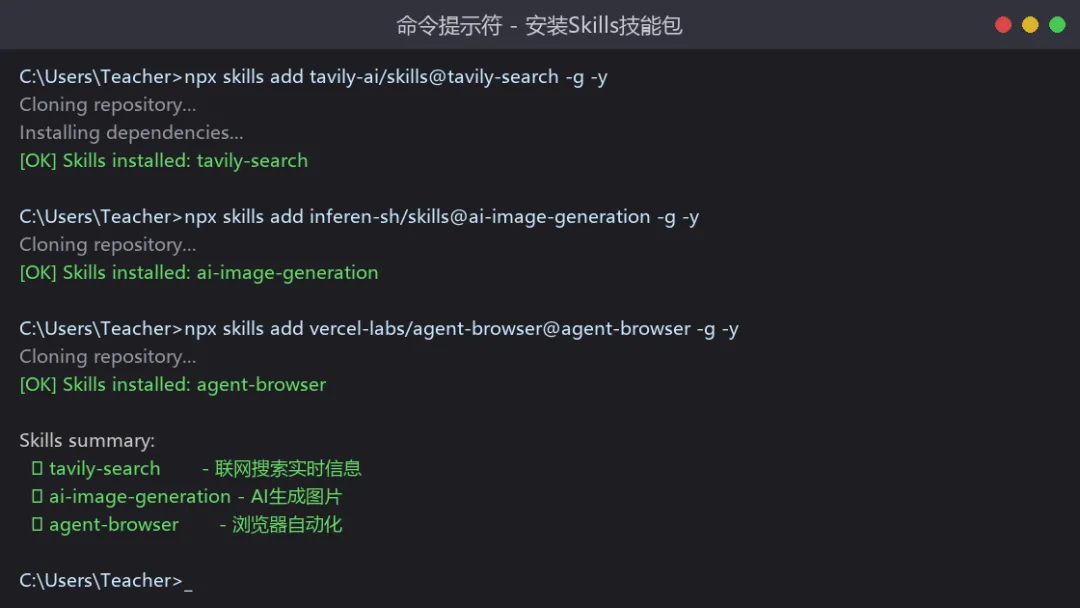 显示"OK Skills installed successfully"即安装成功。