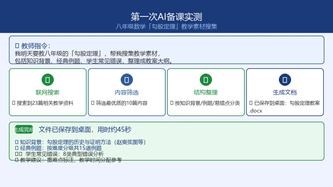 🗣 示例指令(直接复制使用) •我明天要教八年级的「勾股定理」,帮我搜集教学素材, •包括知识背景、经典例题、学生常见错误, •整理成一份教案大纲。 |