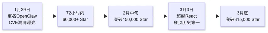 项目经历了两次更名:从最初的Clawdbot到Moltbot,最终在1月29日定名为OpenClaw。同一天,一个CVE安全漏洞(CVE-2026-25253)被曝光,反而加速了项目的传播——安全讨论让更多人注意到了这个项目。