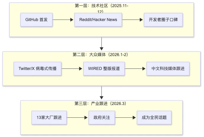 OpenClaw的传播不是偶然的,它遵循了一个清晰的"三层扩散"模式: