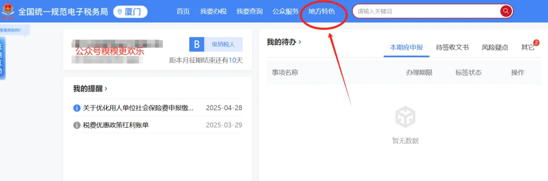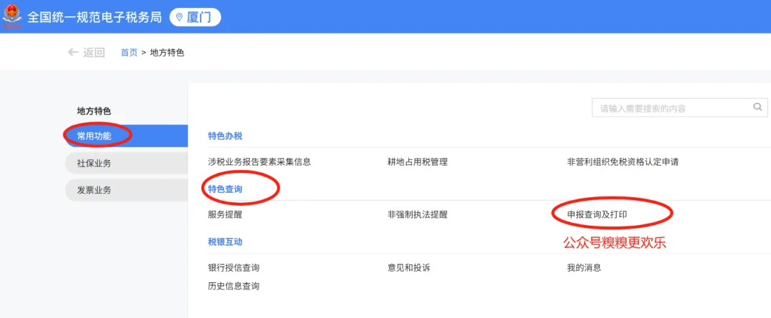 2、想要下载带有税务印章的纳税申报表,需要到电子税务局-【地方特色】-【常用功能】-【特色查询】里面去找到可以下载纳税申报表的选择。比如全国多数地区直接通过在特色查询子项目【申报查询及打印】模块操作。