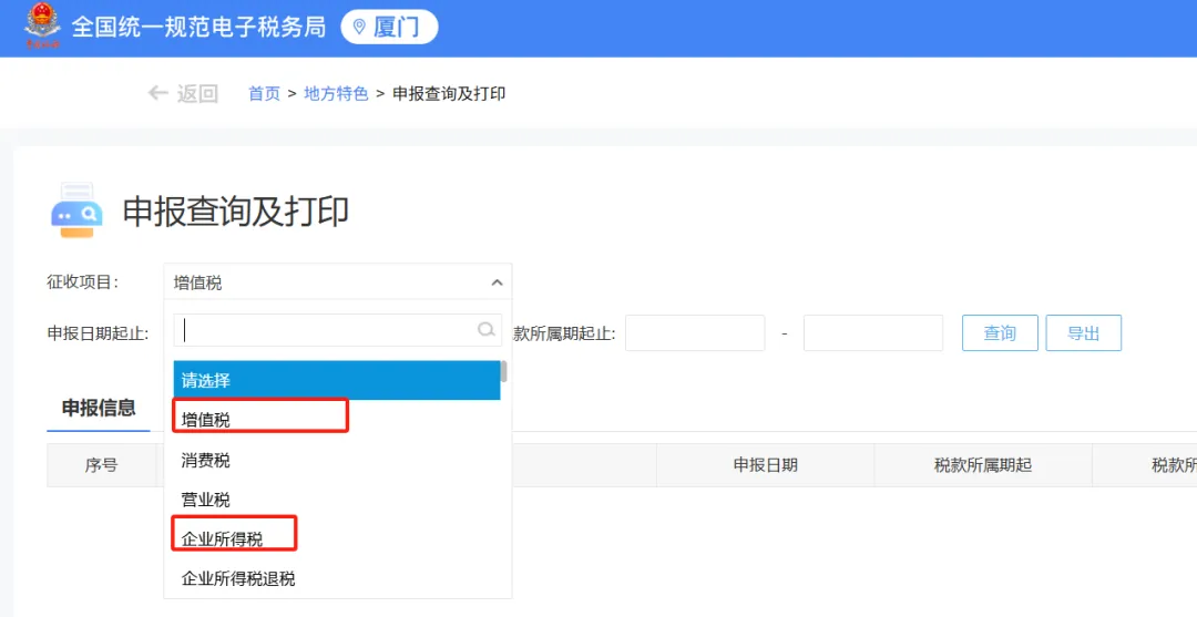 第二步:在 “征收项目” 中选择 你要打印的纳税申报表,比如“增值税”或者“企业所得税”,然后选择需要查询的申报起止日期或税款所属日期进行查询。