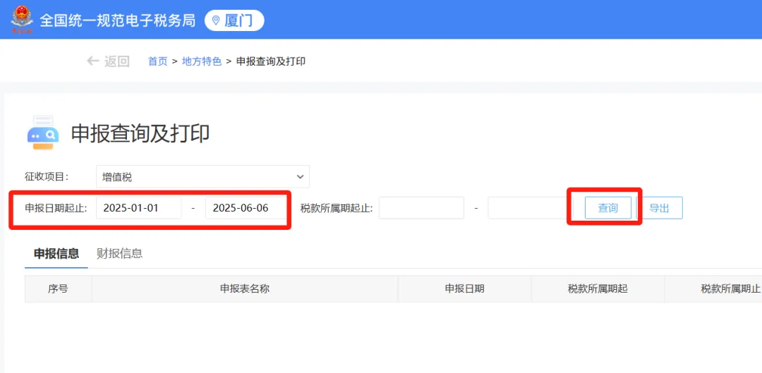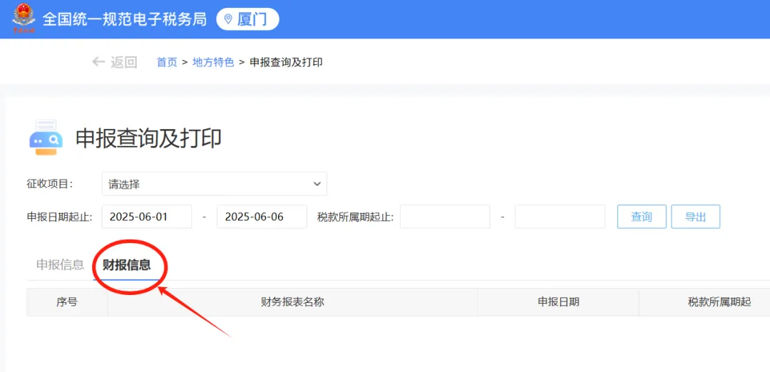 第二步:将界面默认的 “申报信息” 切换为 “财报信息”,然后选择申报日期或税款所属期进行查询。