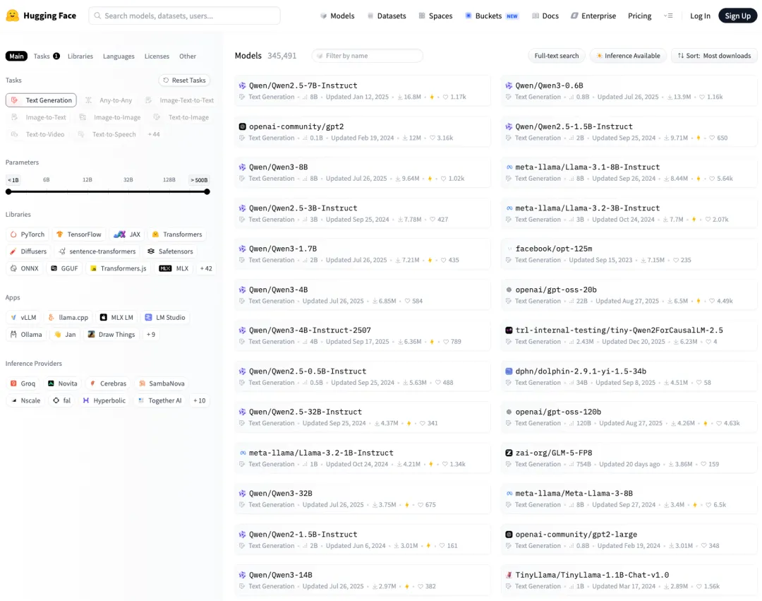 但策略上的含蓄掩盖不住下载量上的碾压。打开Hugging Face按下载量排序,通义千问(Qwen)几乎占满了整个榜单。