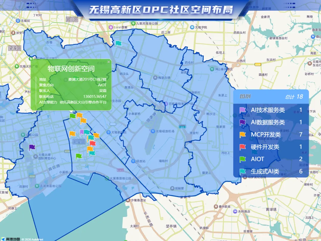 作为全区OPC项目统一入口,各类特色空间一图统览、一键触达。先期覆盖的18个OPC空间,涵盖AI技术服务类、AI数据服务类、MCP开发类、生成式AI等集聚类型。未来,将按照“统一入口、多态空间、集散广场”的整体架构,实现高新区OPC社区的一体化政策供给、资源调度和管理服务。