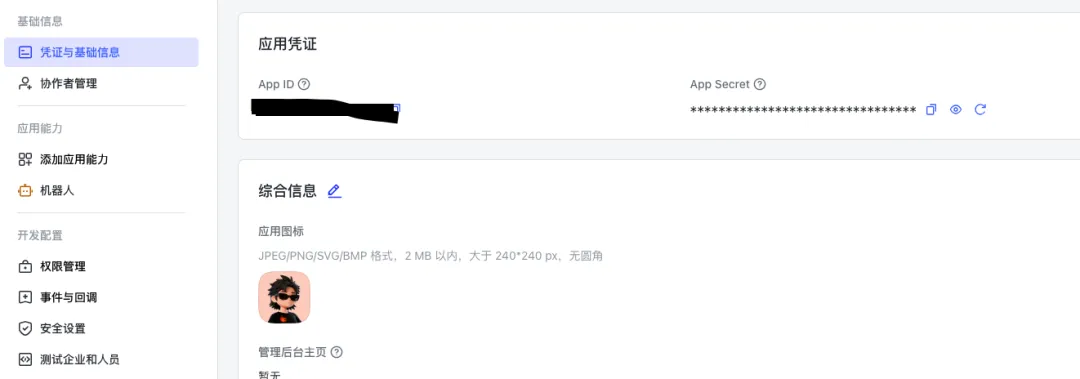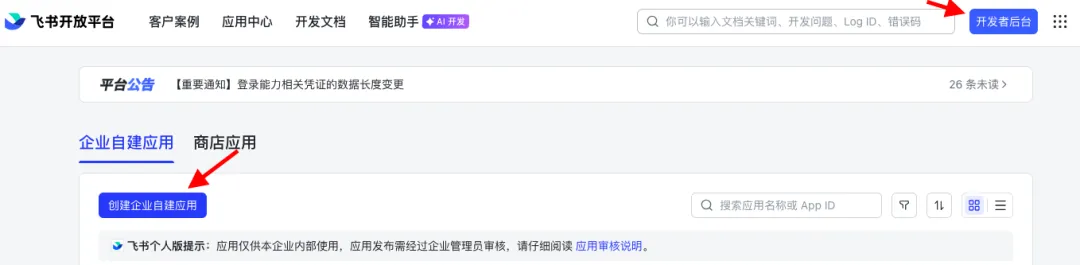 访问 https://open.feishu.cn/ 进入「企业自建应用」 点击「创建应用」 填写应用名称和图标