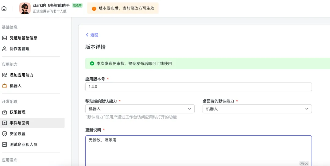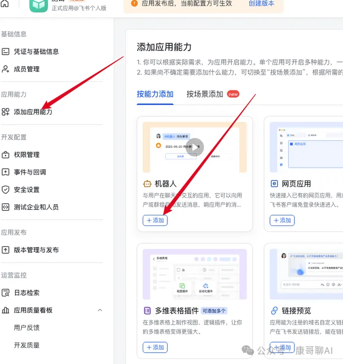 添加「机器人」 启用机器人功能 配置消息权限 设置回调地址 创建版本