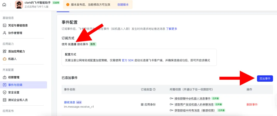 4. 设置回调地址选择官方长连接即可,添加事件中输入:im:message