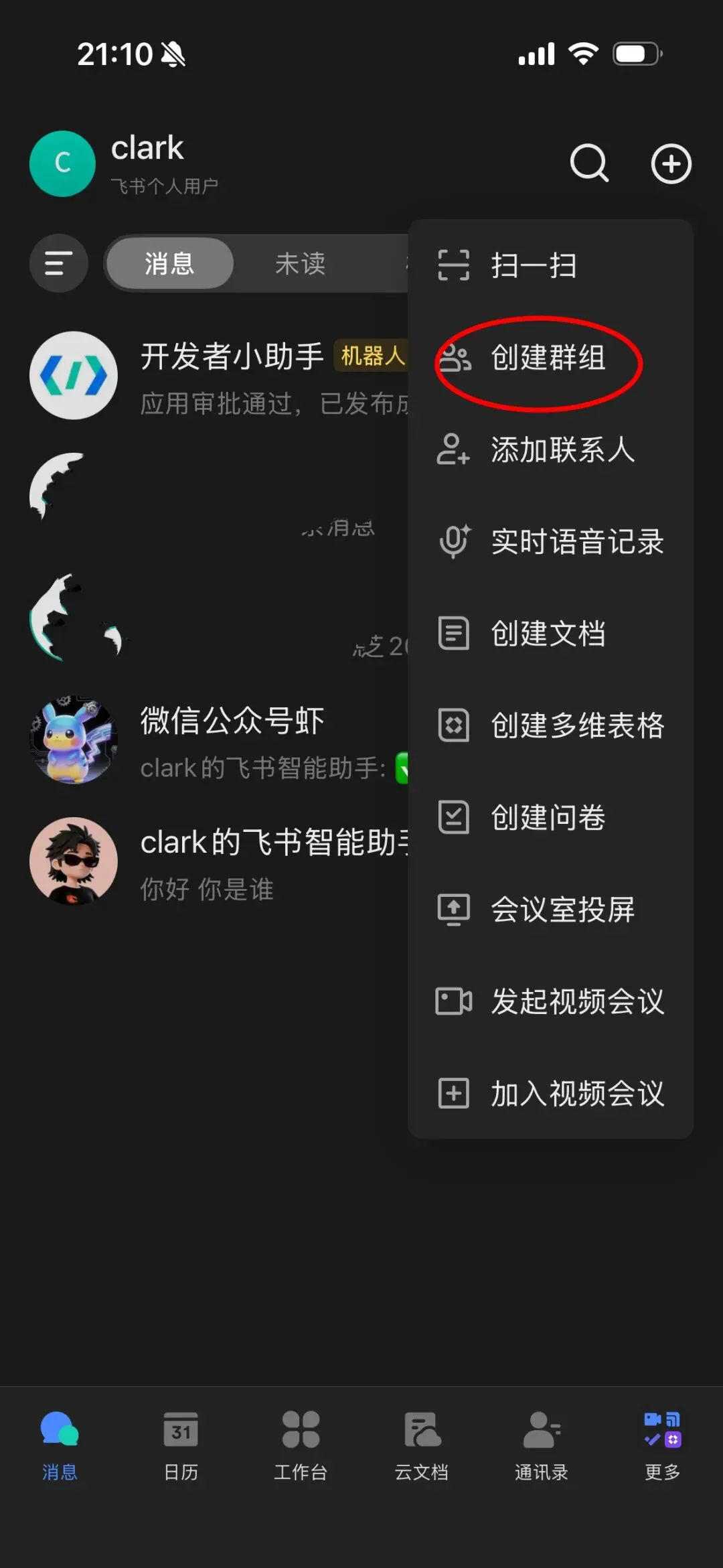 方式二:创建一个群聊,点击群机器人添加机器人,提供群聊oc_id给龙虾,对话时需要@对应机器人