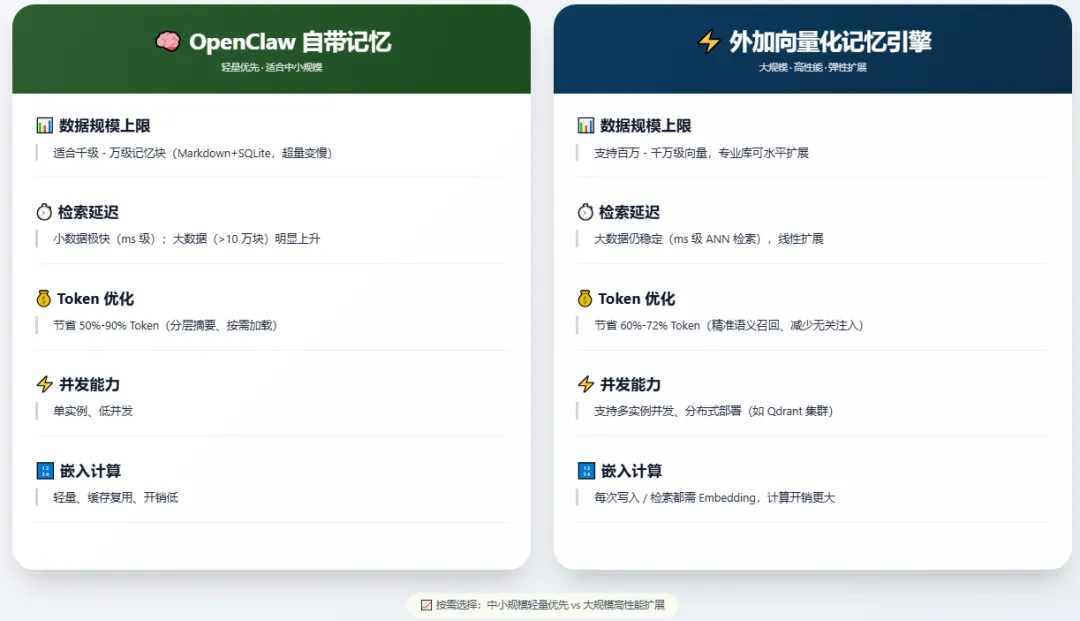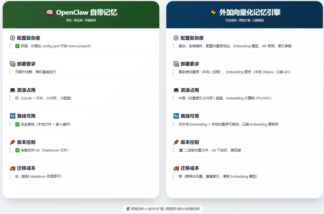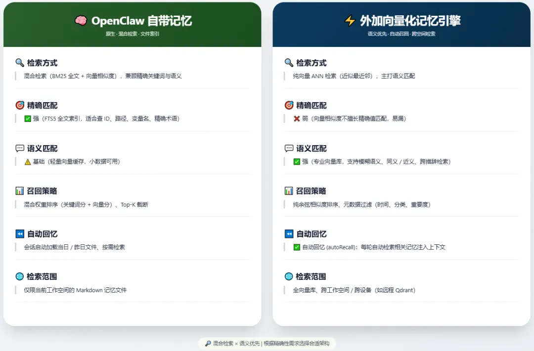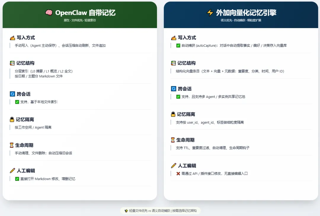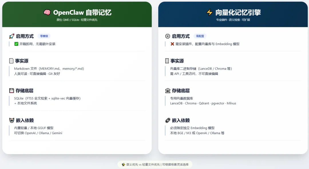 你的openclaw只是一个纯临时聊天窗口把?没有任何记忆的龙虾,就是一个只能聊短对话、重启失忆、无法做长期任务、无法自动化、无法积累知识的纯临时聊天窗口。从春节开始,openclaw那么火,我想大家都用了吧。但是是不是觉得格外的不顺手,没有网上吹嘘得那么厉害。2.由于模型上下文窗口大小的原因,交流经常被迫截断,而且长对话必炸,白白浪费token。6.多步骤任务无法 “接力”。(分析→代码编写→调试→部署)所以,这个时候,就需要使用openclaw的记忆功能+向量化模型了。 下面是他们的优劣势对比表,所以双管齐下,才是正道。一、核心定位与基础属性