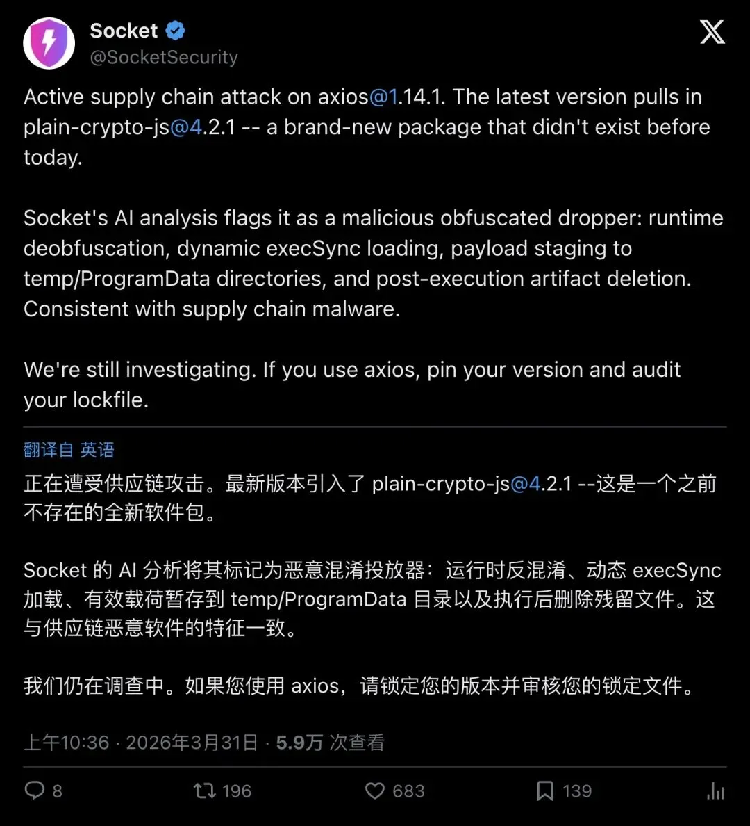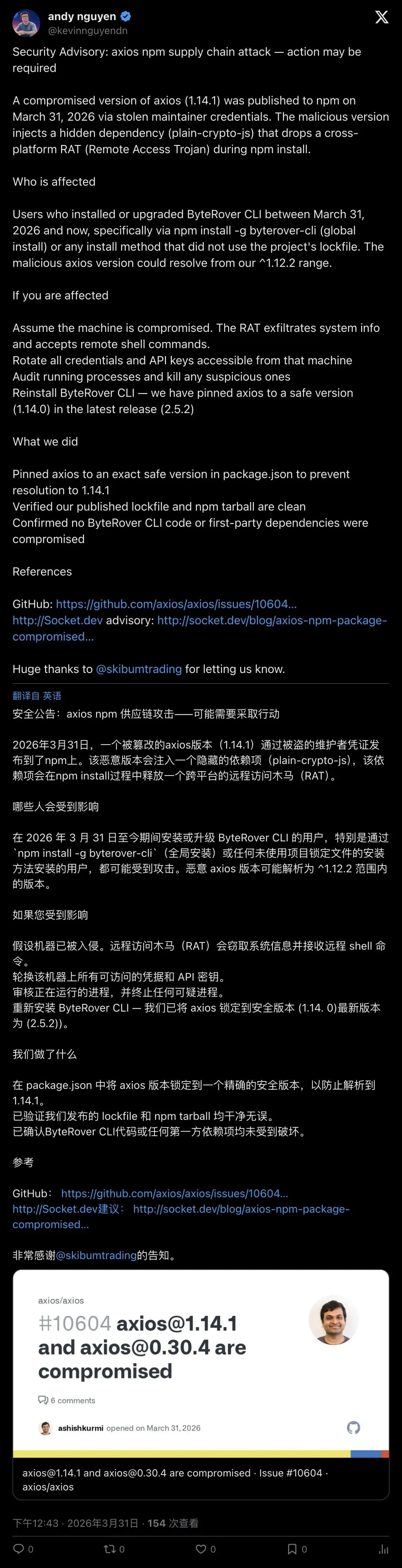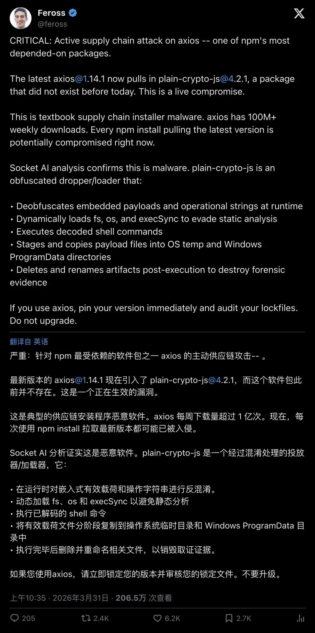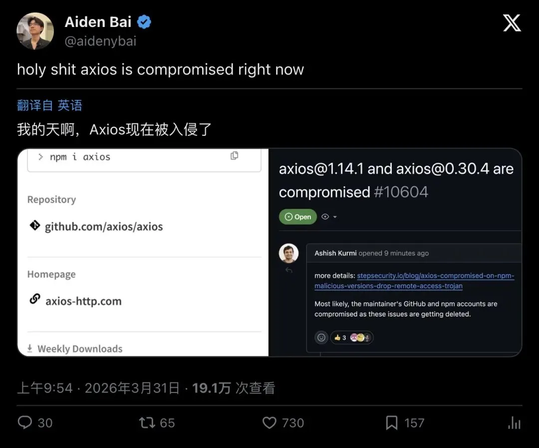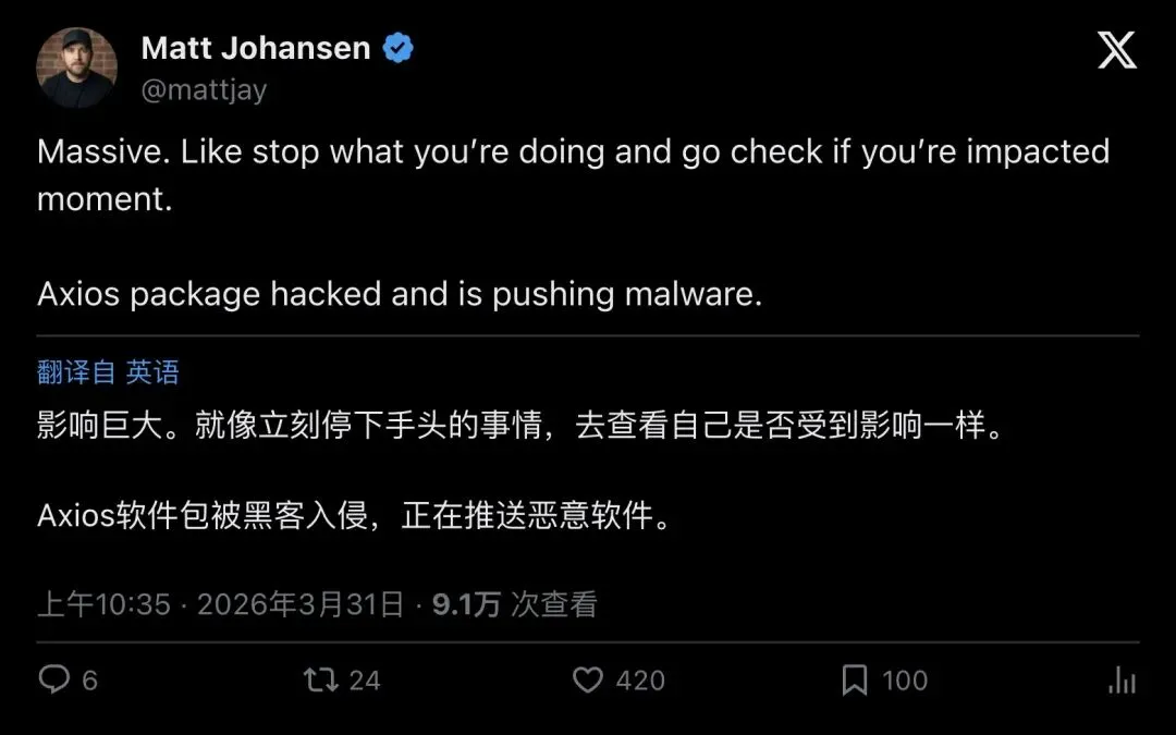 「影响巨大。就是那种需要你立刻停下手头所有事情、去检查自己是否受影响的时刻。Axios 被黑了,正在推送恶意软件。」