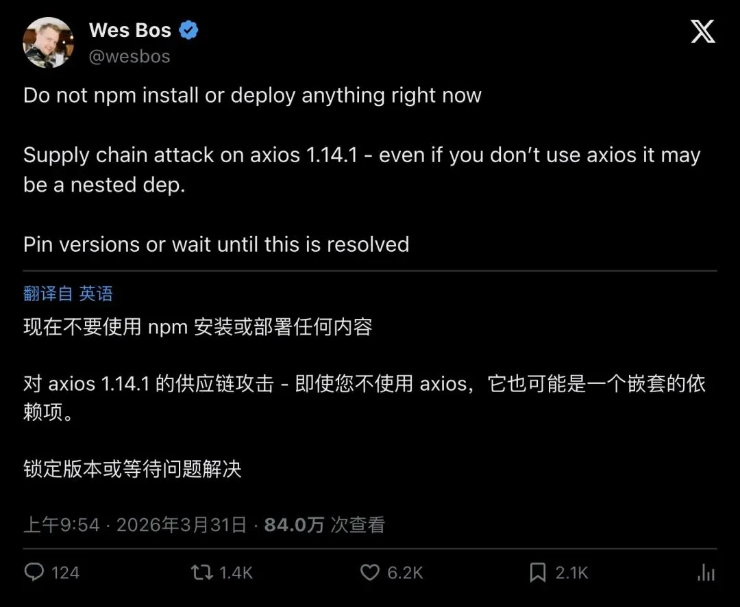 「如果你安装过 axios@1.14.1 或 0.30.4,请直接假设你的系统已经被攻陷。」