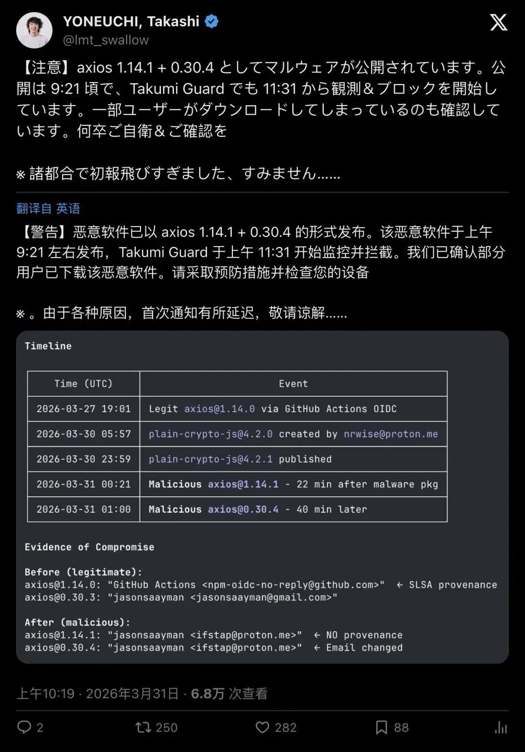 日本安全研究者 YONEUCHI Takashi 在社区同步发出了日文告警,说明这个事件的冲击波已经跨越了语言和时区: