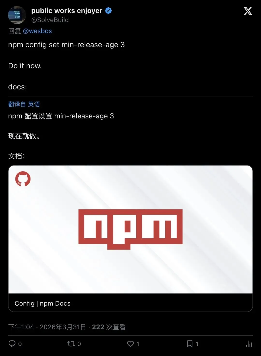 「设置 npm 最小发布年龄为 3 天。现在就做。」