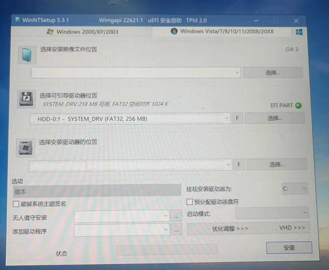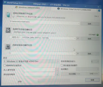 ②进PE → 双击 “Windows安装器”(WinNTSetup)→选择ISO(浏览到你的 Win11/Win10.iso)→选择引导驱动器(ESP分区-300MB左右)→选择安装驱动器(C盘)→版本(家庭/专业,随你)→开始安装