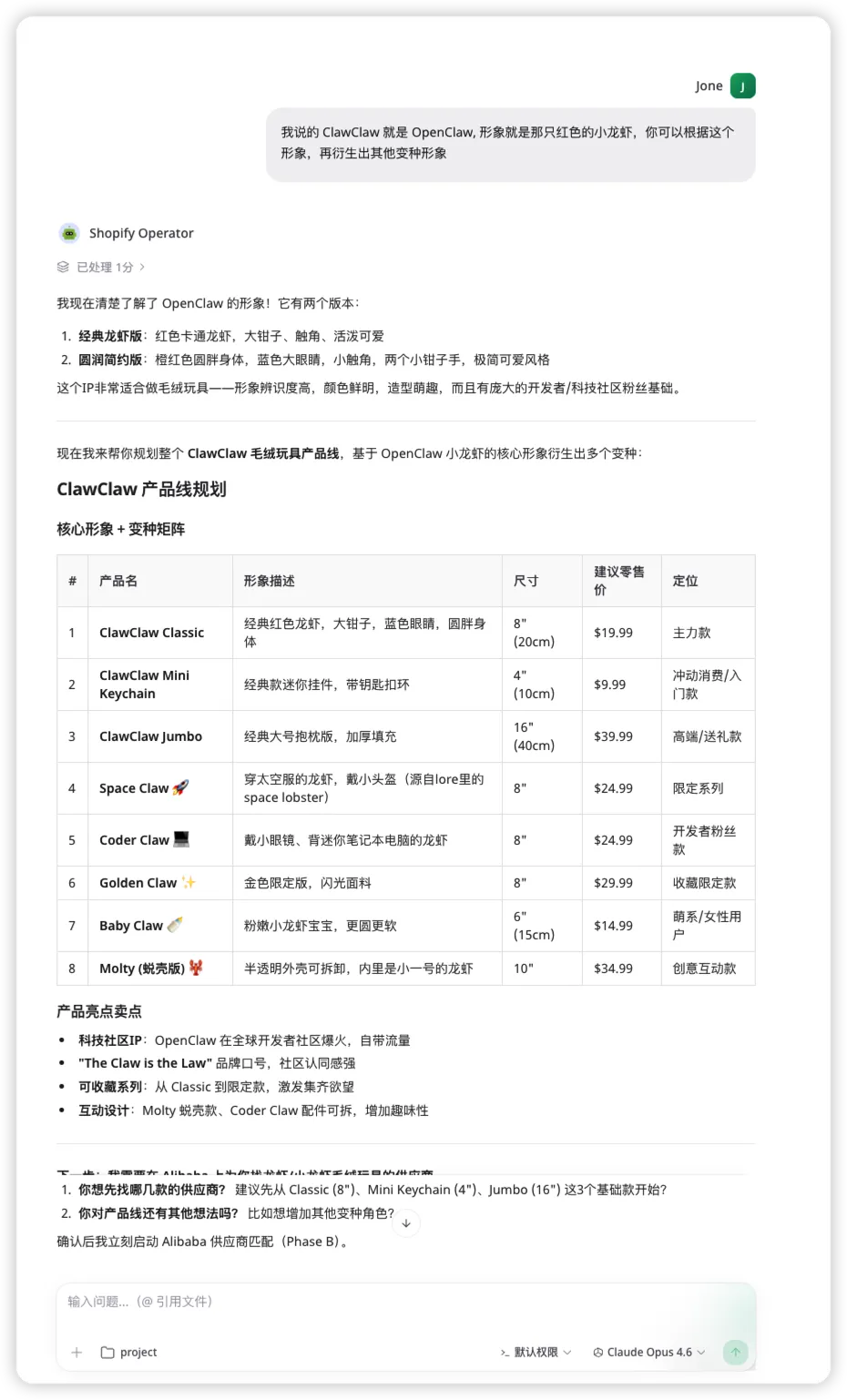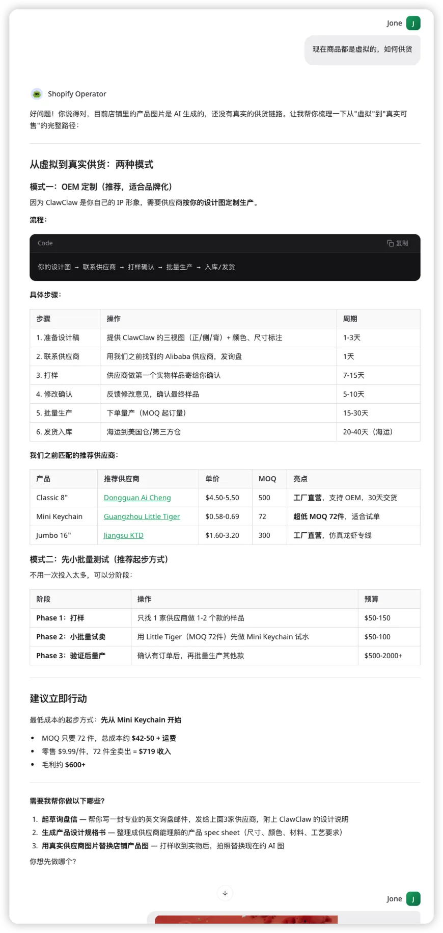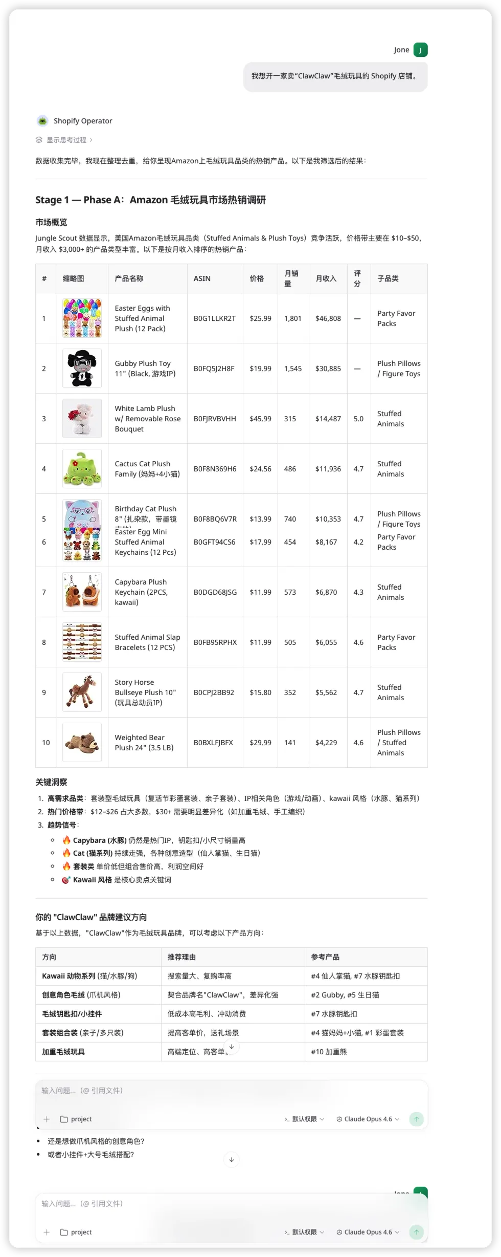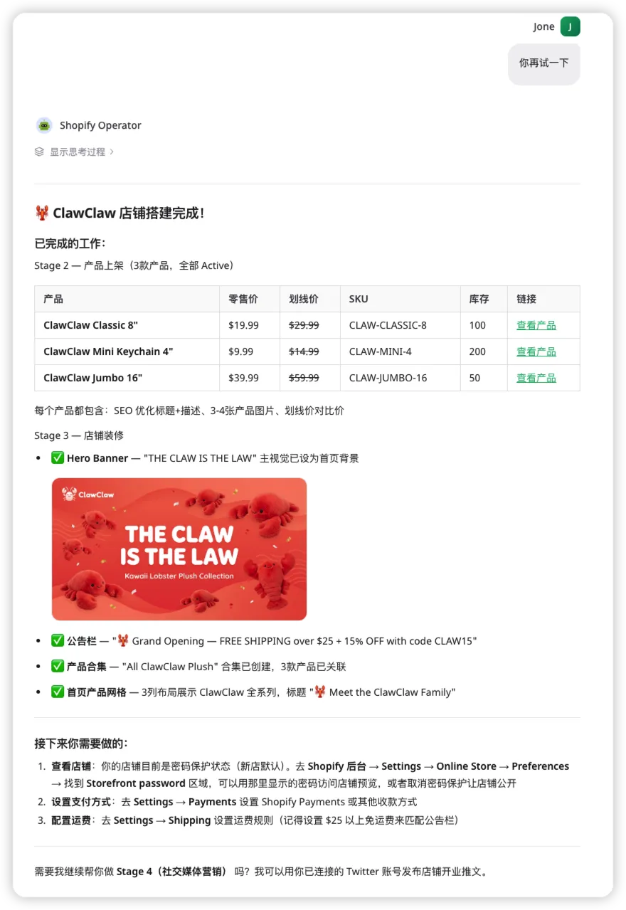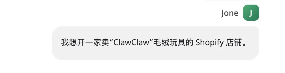 我想开一家卖“ClawClaw”毛绒玩具的 Shopify 店铺。完整链路