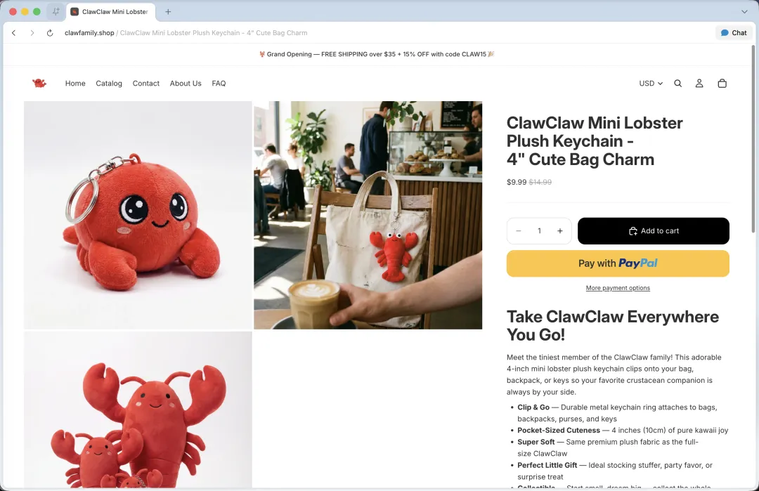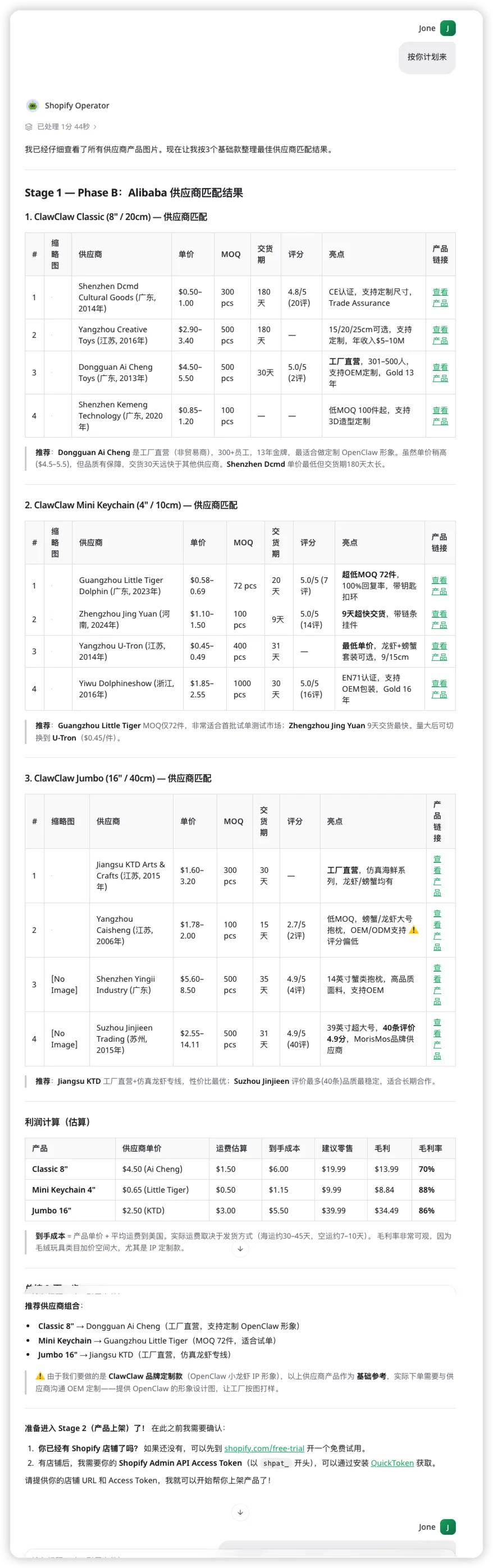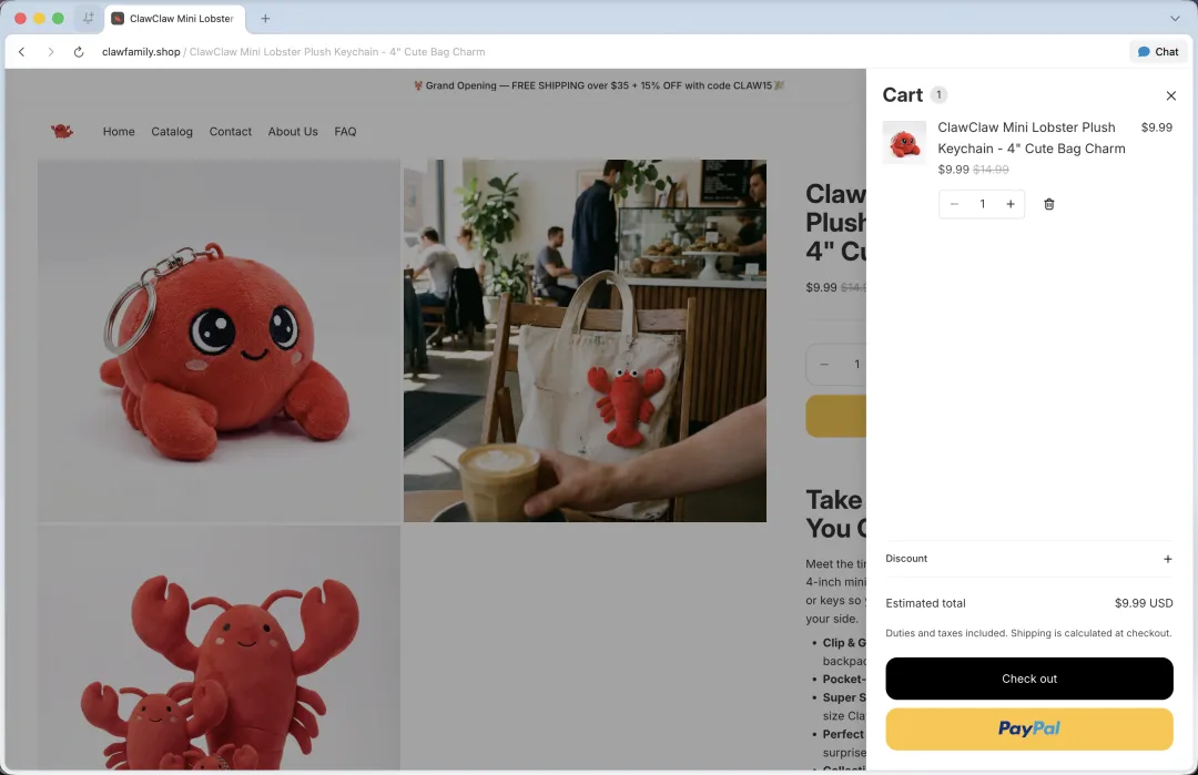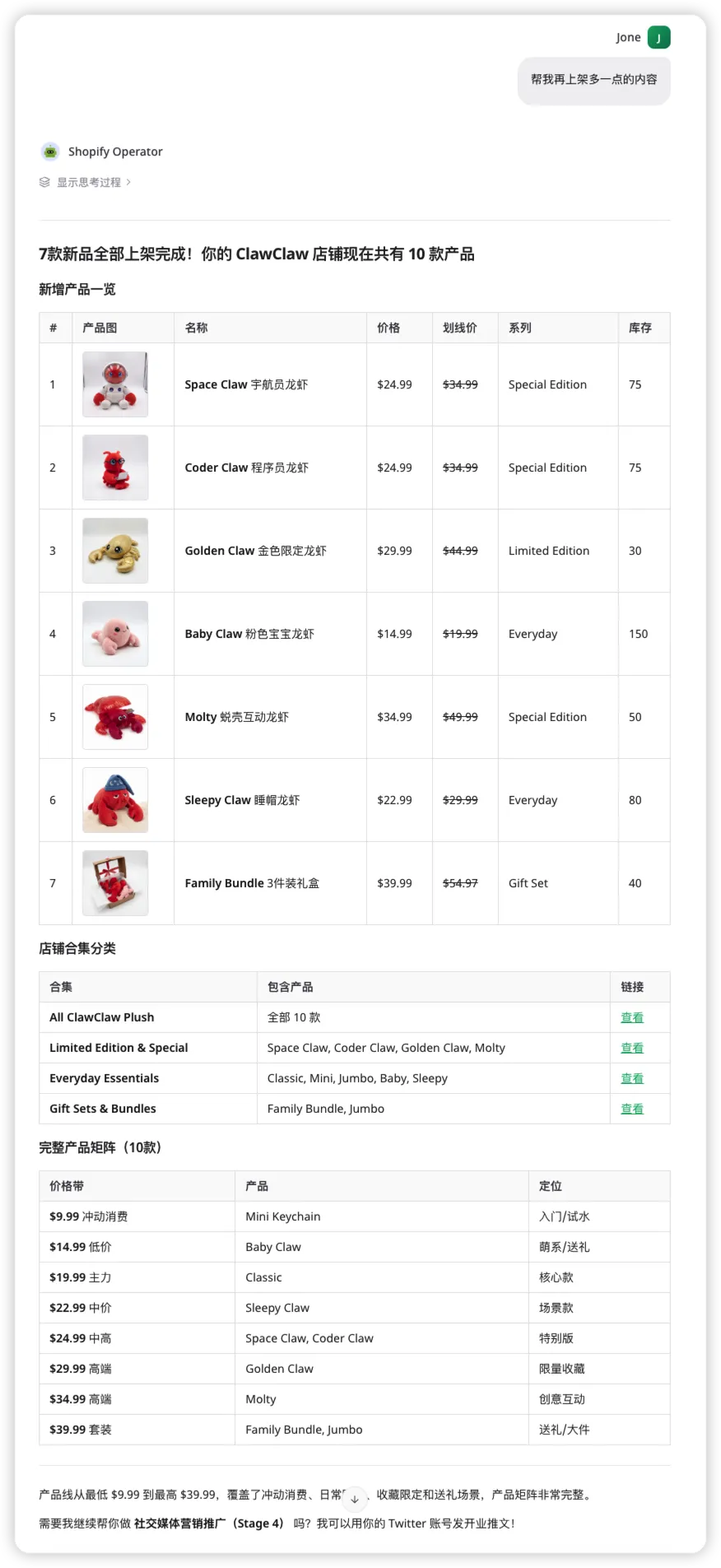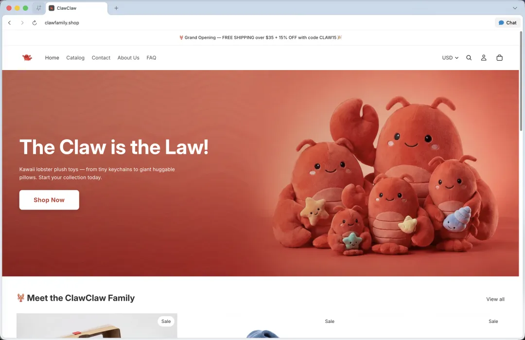 我想开一家卖“ClawClaw”毛绒玩具的 Shopify 店铺。完整链路