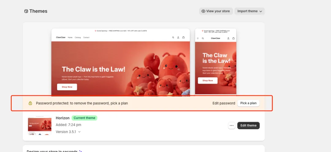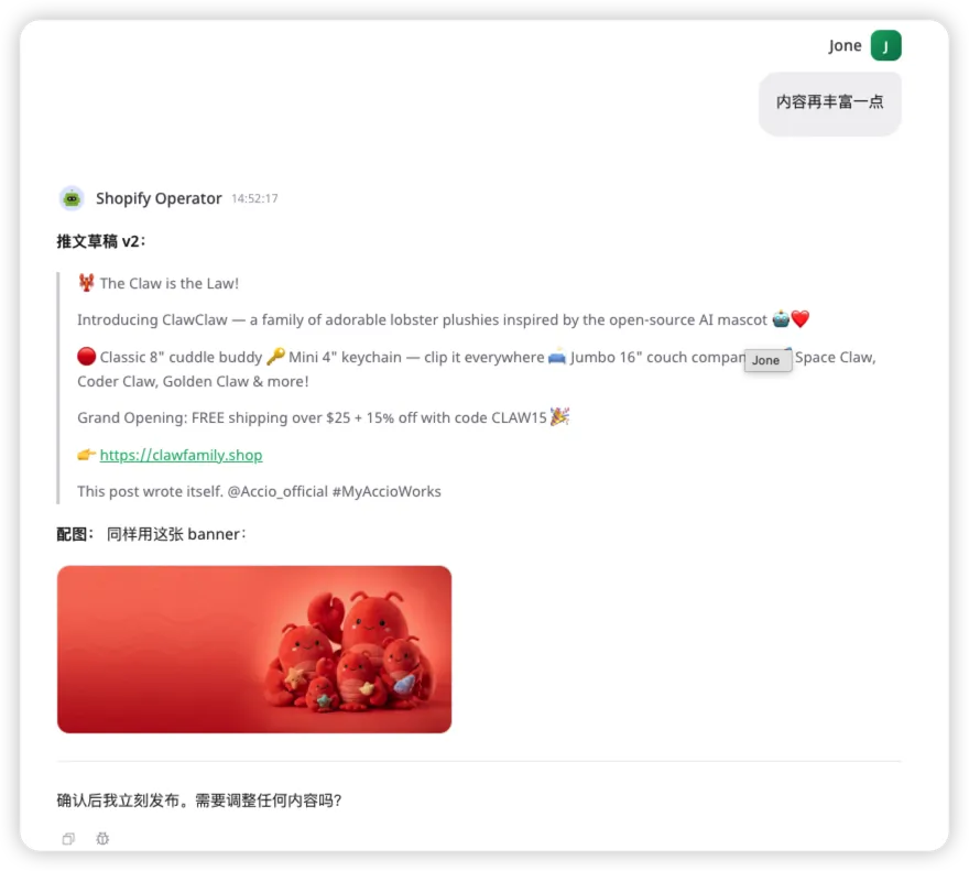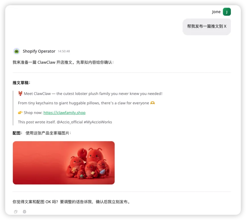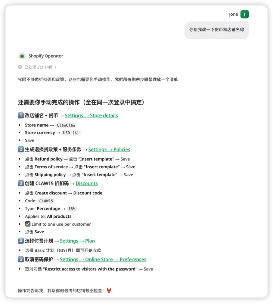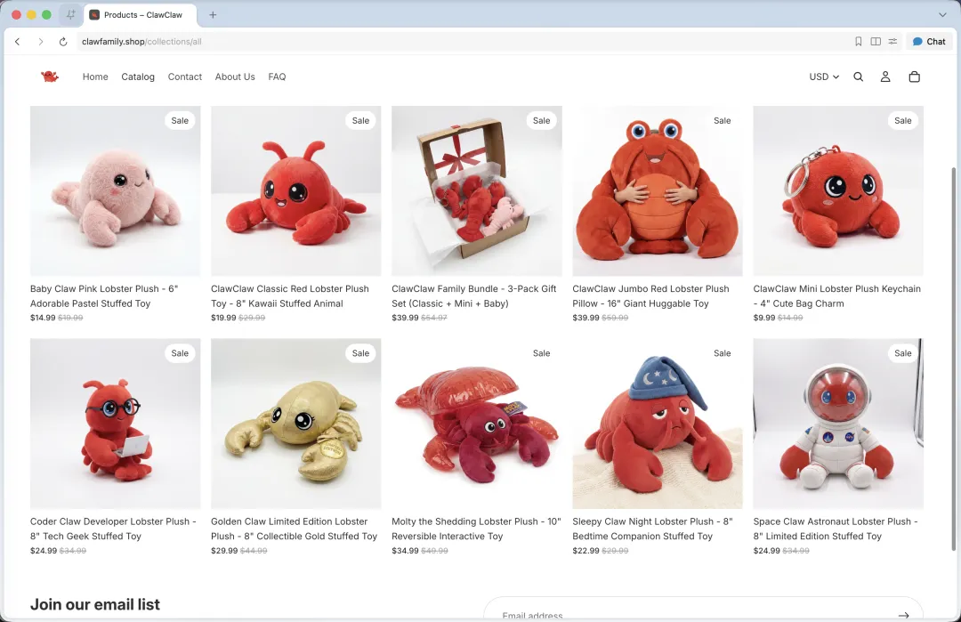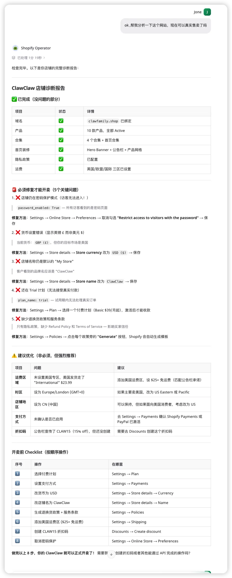 我想开一家卖“ClawClaw”毛绒玩具的 Shopify 店铺。完整链路