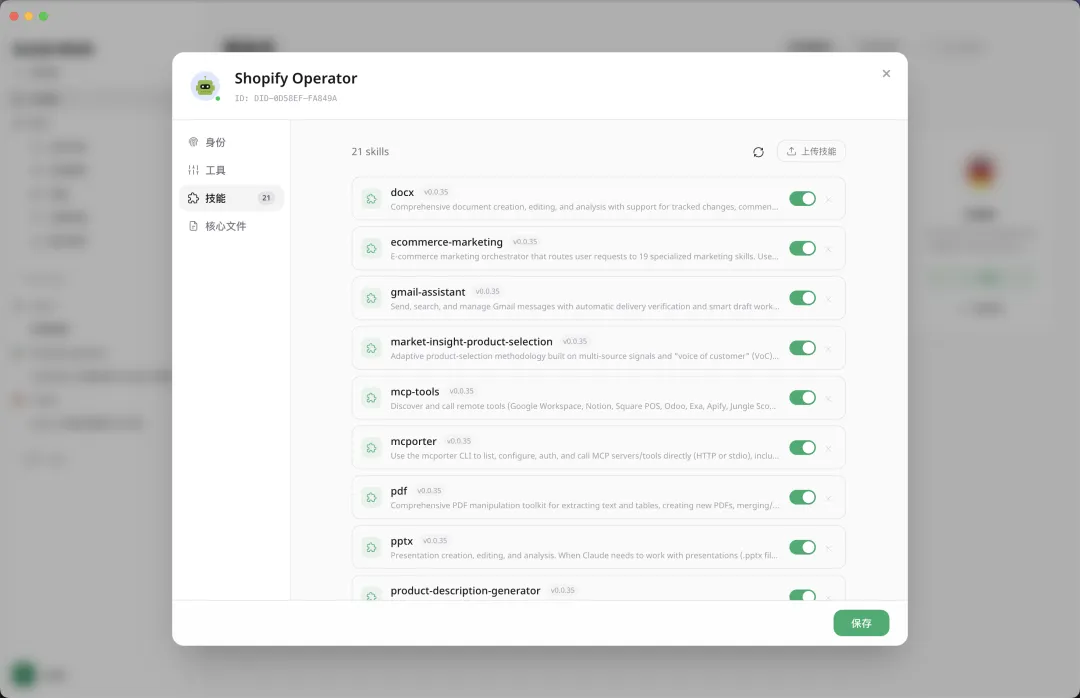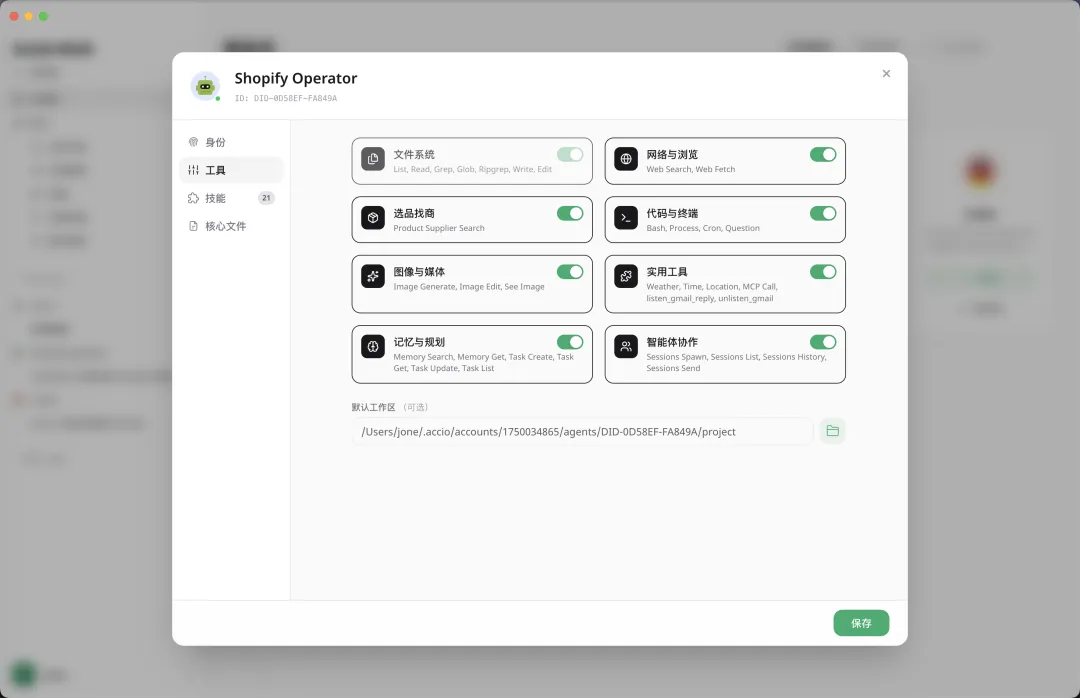 • 文件系统 • 网络与浏览 • 选品找商 • 代码与终端 • 图像与媒体 • 实用工具 • 记忆与规划 • 智能体写作