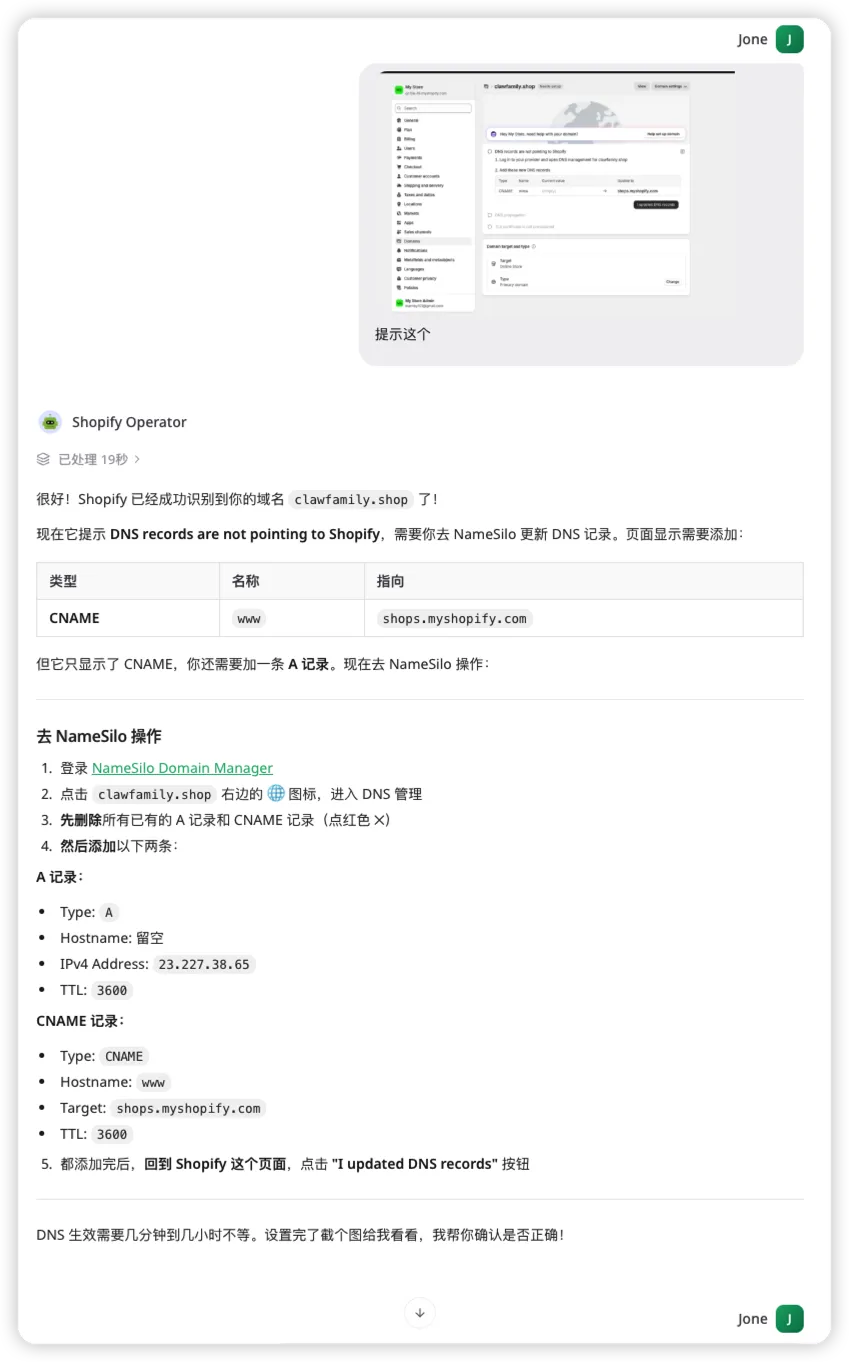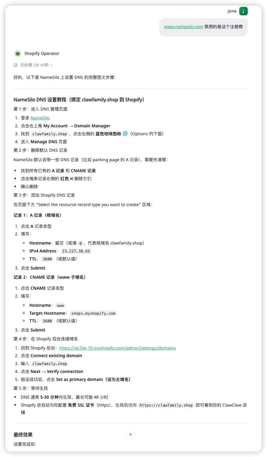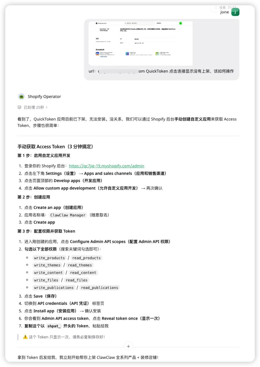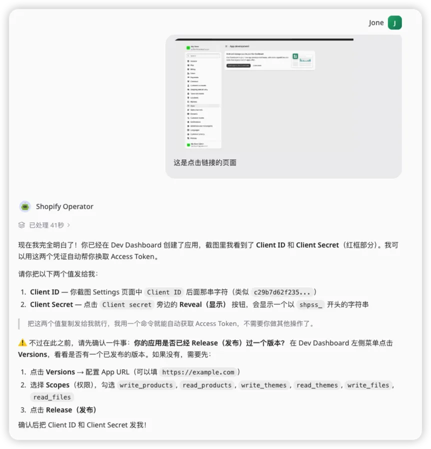 1. 对话是在 Shopify Operator 智能体中进行的 2. 提了一句话需求 3. 我手动展开了思考过程