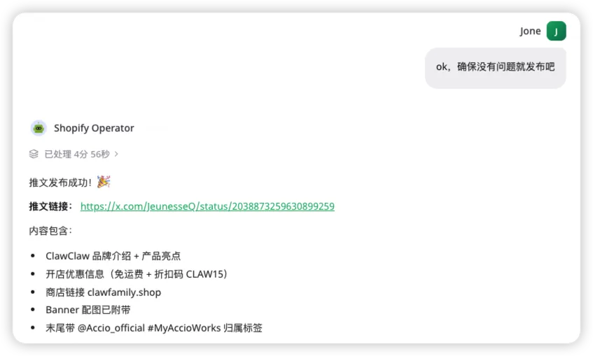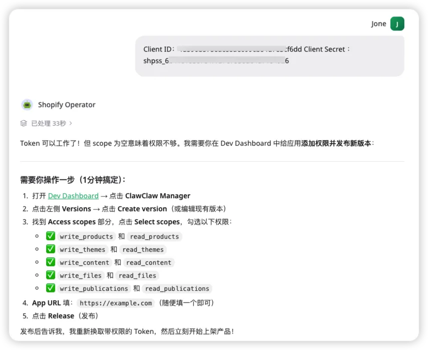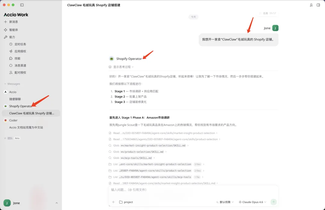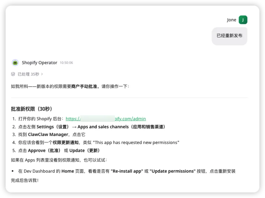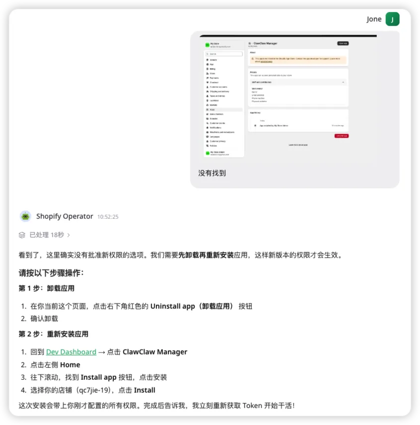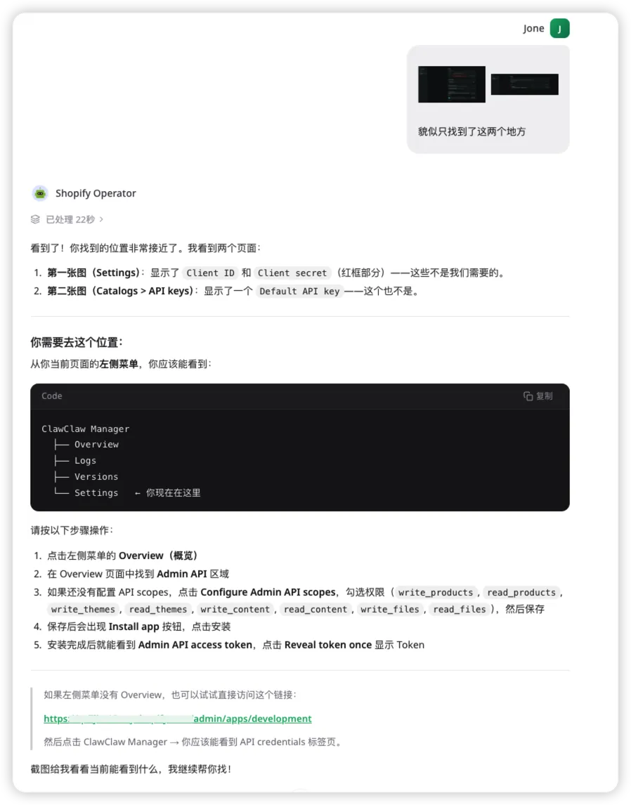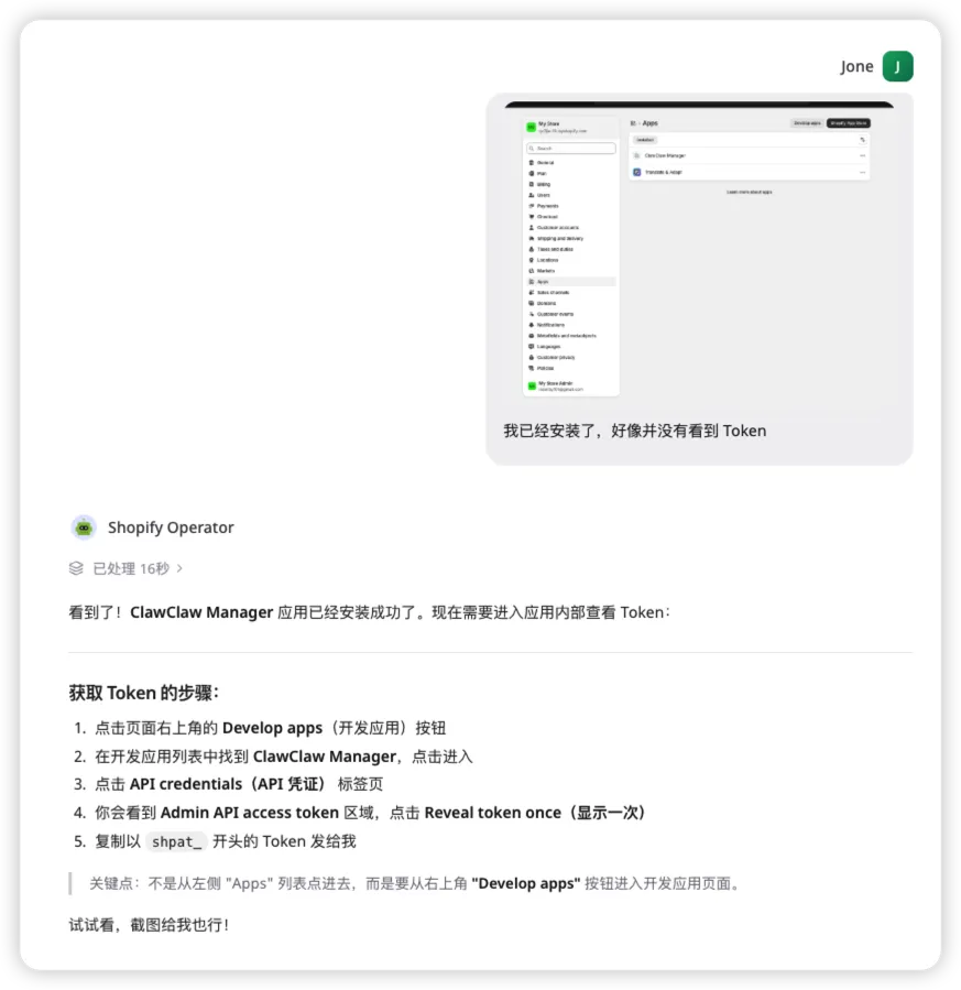 1. 对话是在 Shopify Operator 智能体中进行的 2. 提了一句话需求 3. 我手动展开了思考过程