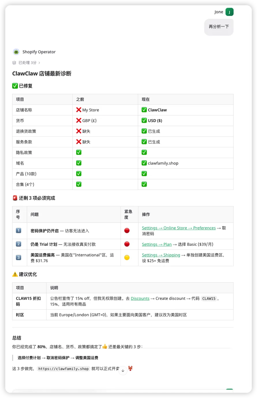 至此经过 12 轮对话,耗时 1 个多小时,终于把店铺搭建好了!(其实,如果对于 Shopify 熟悉的话,估计 5 轮左右就 OK 了)