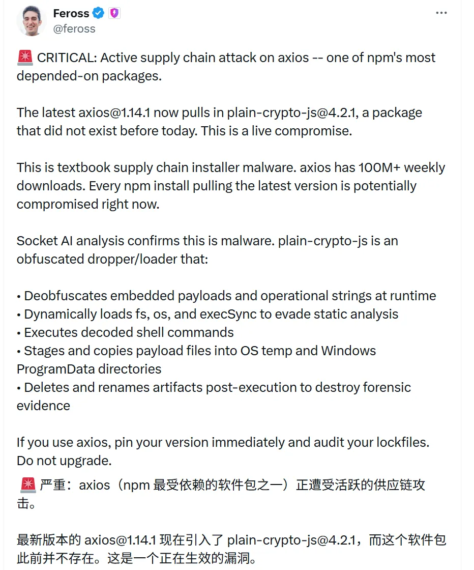 你在指定的时间里(见下文事件时间线)可能装了新版OpenClaw,或者跑过npm install——然后你的机器就被装了远控木马。 —— 出事的是Axios。