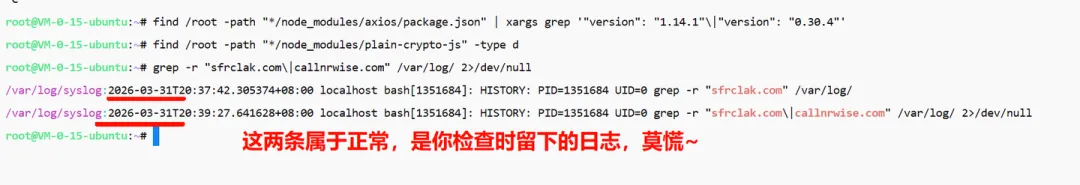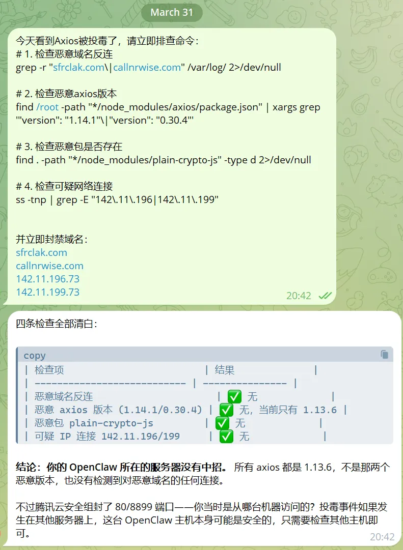 # 1. 检查恶意域名反连grep -r "sfrclak.com\|callnrwise.com" /var/log/ 2>/dev/null# 2. 检查恶意axios版本find /root -path "*/node_modules/axios/package.json" | xargs grep '"version": "1.14.1"\|"version": "0.30.4"'# 3. 检查恶意包是否存在find . -path "*/node_modules/plain-crypto-js" -type d 2>/dev/null# 4. 检查可疑网络连接ss -tnp | grep -E "142\.11\.196|142\.11\.199"
