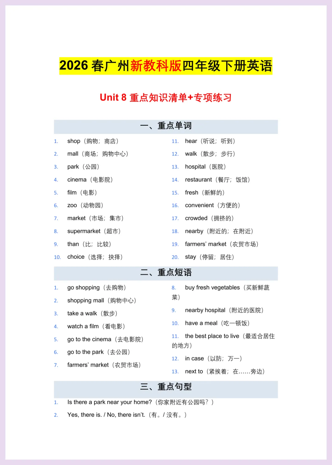 2024 年春教科版四年级下册英语第八单元重点清单加专项练习,共 3 页精华内容。这份资料梳理了本单元核心词汇、句型及语法考点,并搭配针对性习题,帮助孩子快速掌握重难点,夯实基础的同时提升解题能力,轻松应对校内测验。内容精炼实用,复习效率翻倍,需要的家长抓紧打印出来给孩子练一练吧!