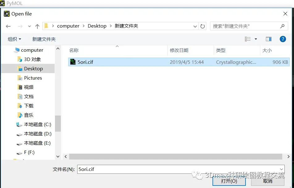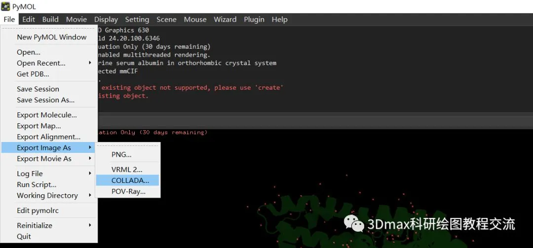 3. 打开PyMol 软件,导入相应的cif格式文件,编辑修改(该软件非小编本专业所用,并不是很熟,所以此处不再班门弄斧进行修改了,只演示过程,提供思路,具体操作请自行进行),导出图片(选择第二或三个均可,一个wrl、一个dae格式)。
