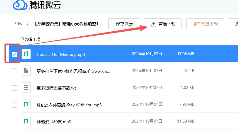 鼠标点击左侧方框,勾选要下载的文件,再点击普通下载