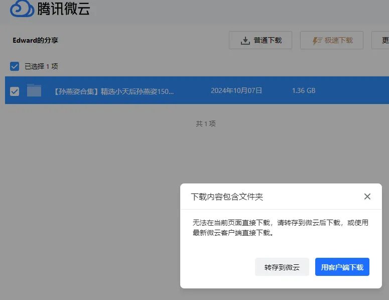 如果直接勾选文件夹—普通下载,会提示用客户端下载,如下图。