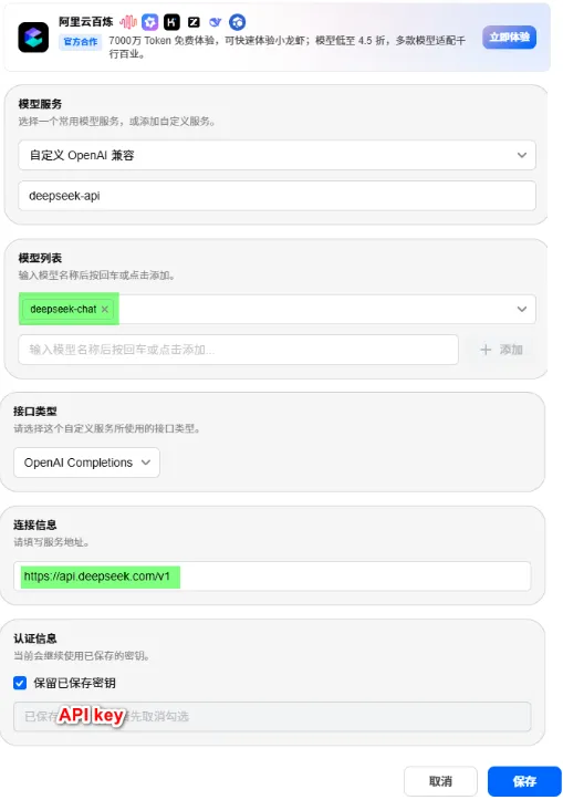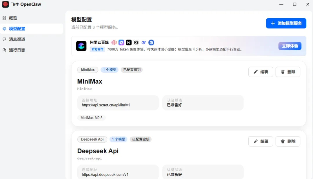 OpenClaw 支持多个模型提供商同时配置,不同场景需要不同能力——复杂推理用主力模型,快速问答用轻量模型,成本和体验都要兼顾。**配置方法**:点击"添加模型服务",填写大模型名称、 Base URL 和 API Key(需要提前申请好)。以下是 DeepSeek 的配置截图供参考:配置好一个大模型后,再配置其它大模型时,可以直接让小龙虾自动配置,只需将Base URL、Models、API key直接发给小龙虾即可,自动配置完成后,可以让它进行测试是否配置成功;优先**手动配置**,避免 API Key 明文发送给小龙虾配置不成功时,检查 **Base URL** 是否正确支持配置备用模型——主力模型挂了自动切换,不怕断线03配置消息渠道