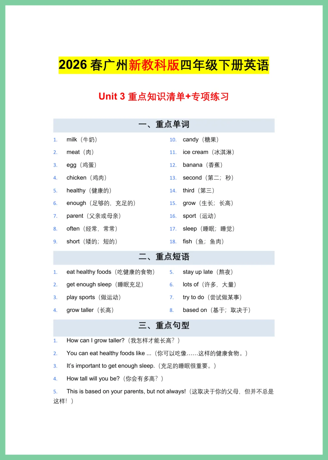 2024 年春教科版四年级下册英语第三单元重点清单加专项练习,共 3 页精华内容。这份资料梳理了本单元核心词汇、句型及语法考点,并搭配针对性习题,帮助孩子快速掌握重难点,巩固课堂所学。通过讲练结合的方式,让孩子在练习中查漏补缺,轻松提升英语成绩,备战单元测试。资料排版清晰,方便直接打印使用。需要的家长抓紧下载打印,给孩子练一练吧!