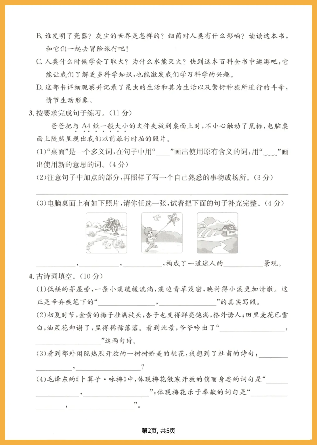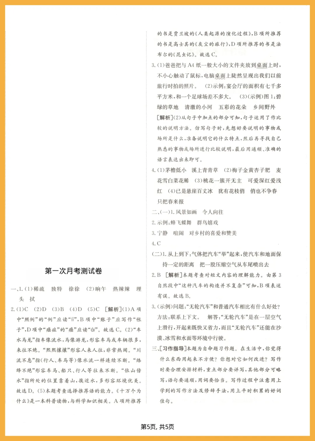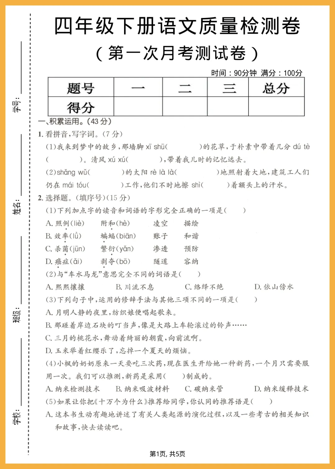 2024 年春季部编版四年级下册语文第一次月考质量检测卷,共 5 页高清电子版。这套试卷紧扣教材重点,涵盖字词积累、阅读理解及习作表达等核心板块,题型新颖且难易适中。它能帮助孩子全面检验第一单元的学习成果,精准定位知识盲区,通过实战演练提升答题技巧与应试信心,为月考做好充分准备。机会难得,有需要的家长赶紧下载打印,让孩子趁热打铁练一练吧!