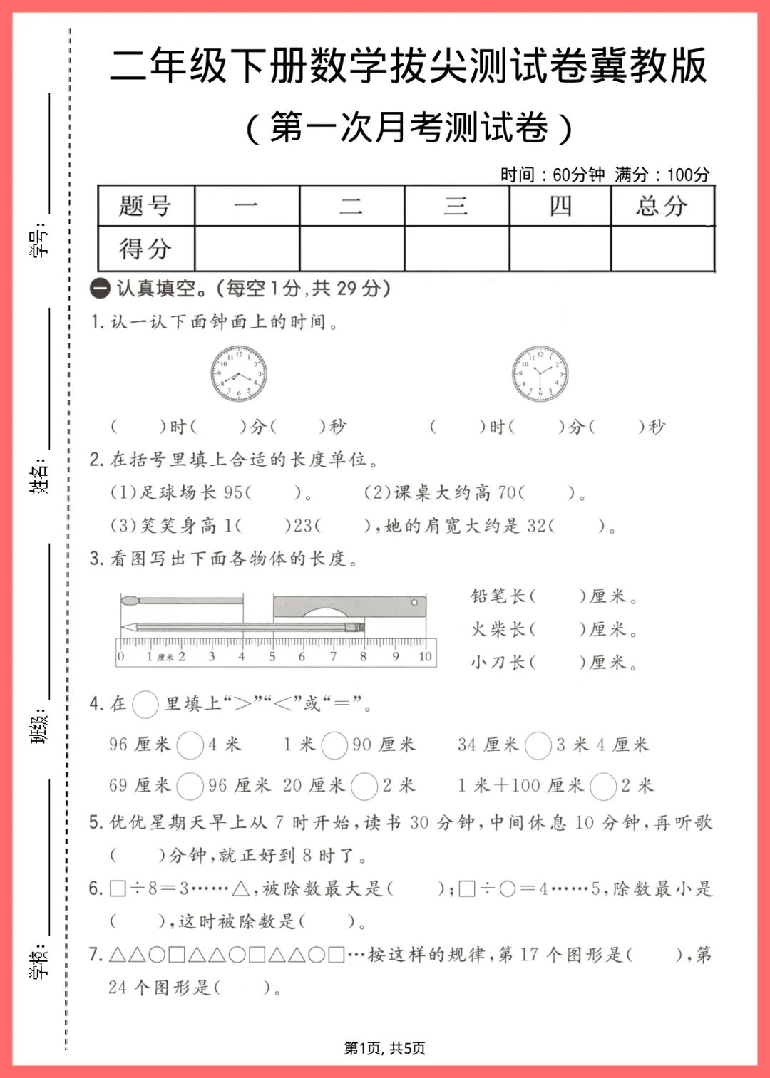 2024 年春冀教版二年级下册数学第一次月考拔尖测试卷,共 5 页电子版,支持打印下载。这套试卷专为月考冲刺设计,紧扣教材重点难点,涵盖计算、图形及应用题等核心考点。题目由浅入深,既能帮孩子夯实基础,又能通过拔高题拓展思维,提前适应考试节奏,精准查漏补缺。想要孩子在月考中脱颖而出?有需要的家长抓紧打印出来,让孩子练一练吧!