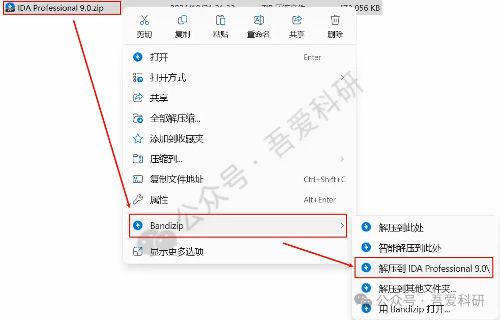 1.选中下载好的安装包,右键解压到“IDA Professional 9.0”文件夹