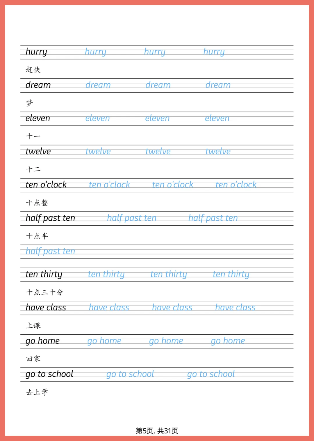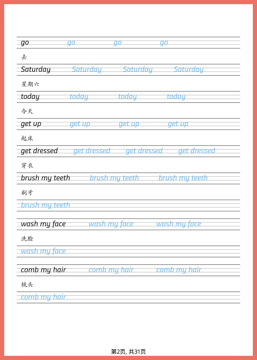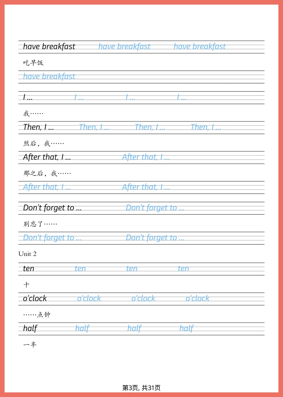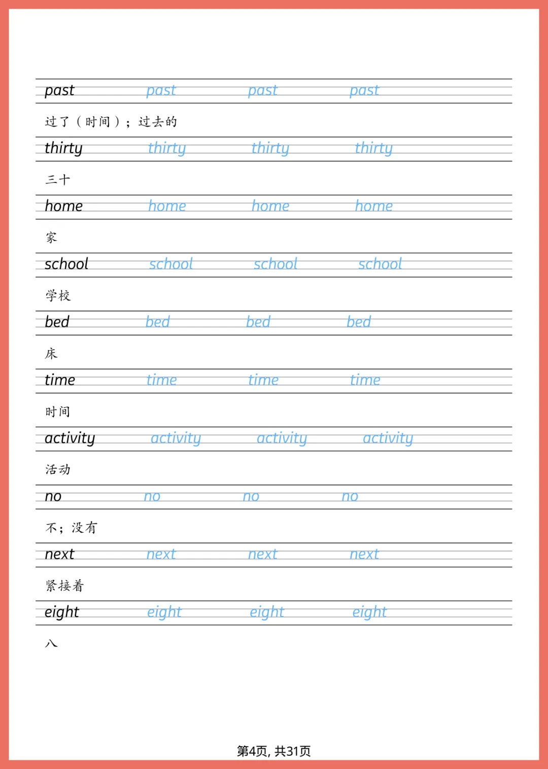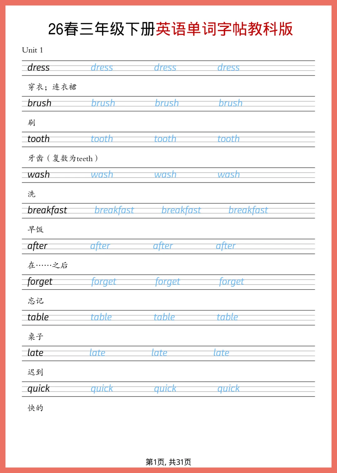 2026 年春季教科版三年级下册英语单词字帖来啦,全套共 31 页,电子版高清可打印。这份字帖紧扣教材核心词汇,采用规范书写格式,让孩子在描红中轻松掌握单词拼写与笔顺。坚持练习不仅能夯实基础,还能有效改善书写习惯,提升卷面整洁度,为英语学习打下坚实根基。趁现在赶紧下载打印,每天陪孩子练一练,新学期英语成绩更上一层楼!