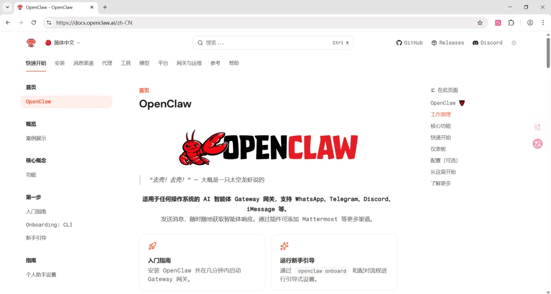 官方入门指南:https://docs.openclaw.ai/zh-CN
