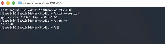 环境都安装完成后需要验证下npm和git是否都正常安装了,需要打开终端输入下面命令:
