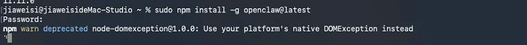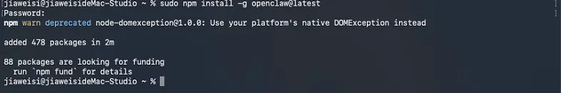 环境都安装完成后,就可以开始通过npm安装OpenClaw了。这里需要注意安装需要root权限,因为我们是普通用户,所以需要通过sodo提权安装: