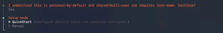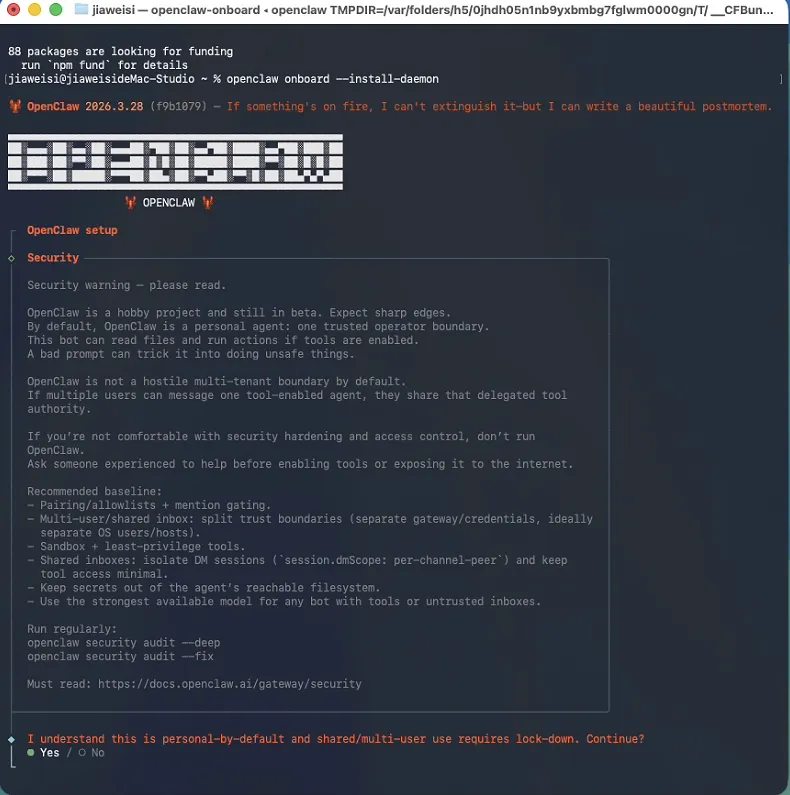 openclaw onboard --install-daemon运行后进入交互界面,首屏有安全警告,选择Yes后按回车继续::