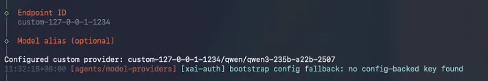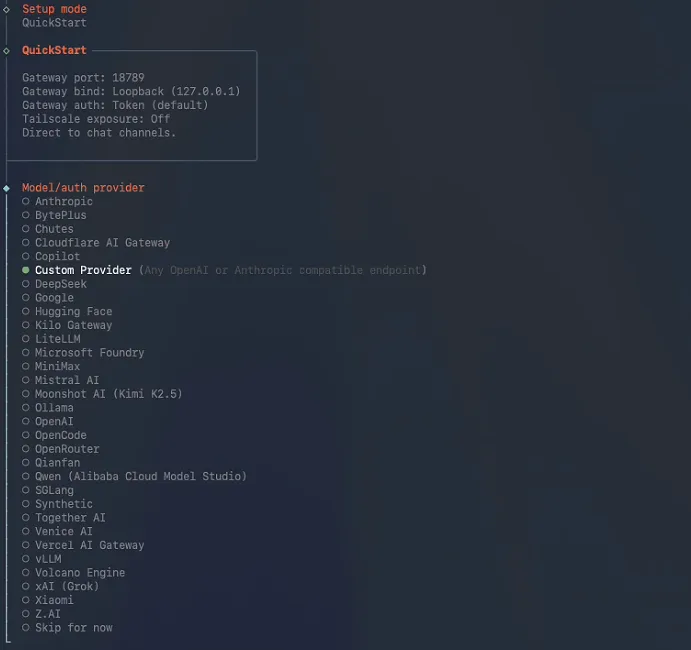 选择模型配置,这里因为使用本地模型所以选择Custom Provider自定义模型信息,如果使用其他公开的模型服务商选择对应的就行: